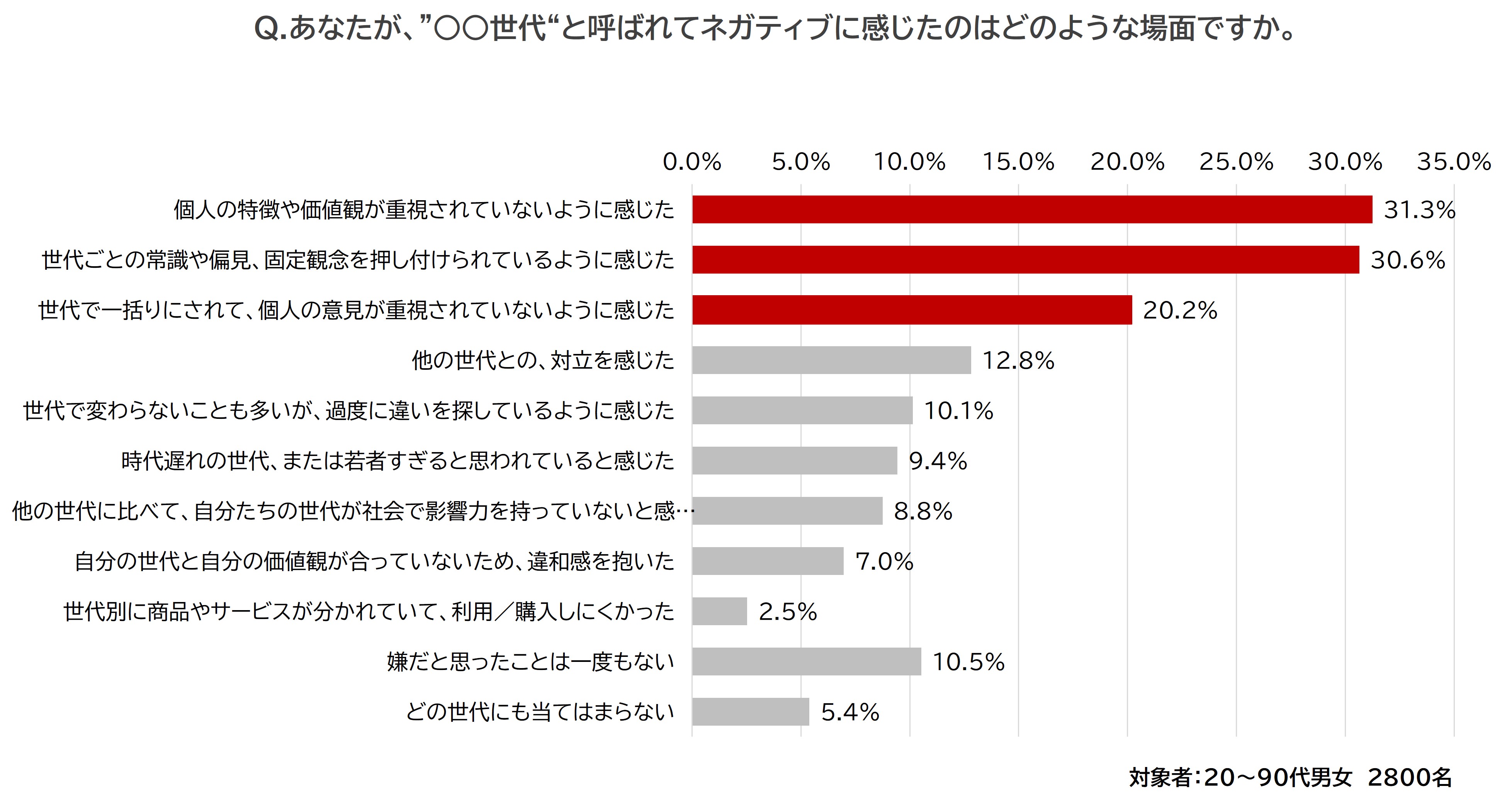 すると、TOP3に「個人の特徴や価値感が重視されていないように感じる」「世代ごとの偏見を押しつけられているように感じた」「個人の意見が重視されていない形になっていると思った」が上位に。