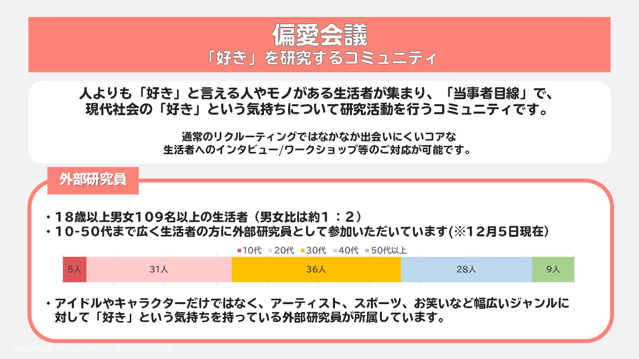 過去に発想技研傘下の博報堂若者研究所にて実施していた、偏愛を持つ若者同士の対話の場である従来の「偏愛会議」をコミュニティ型の研究プロジェクトとして発展させることで、より広く生活者の「好き」という気持ちへの研究活動を行ってまいります。