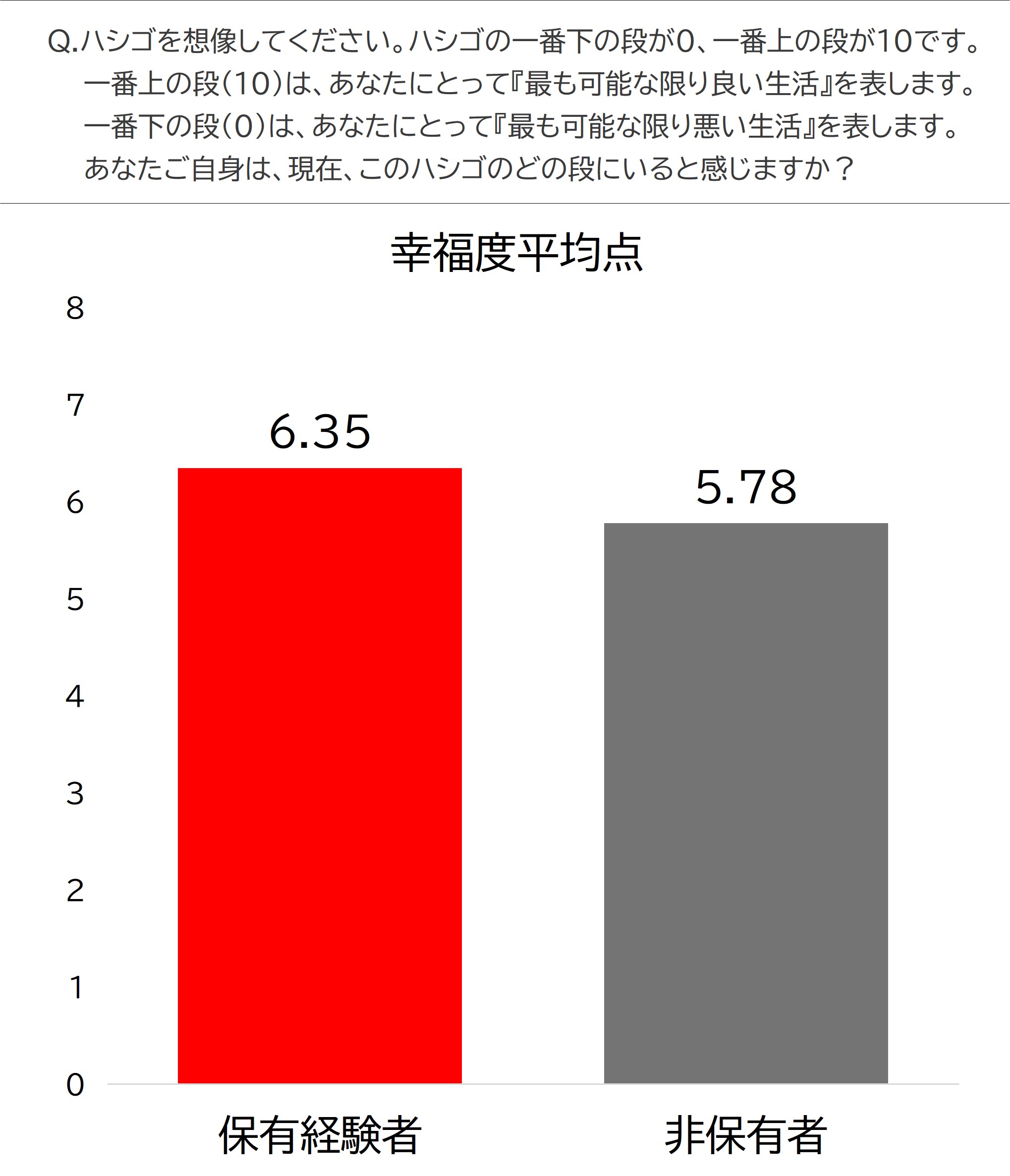 そもそも、ぬいぐるみおじさんは幸せなのでしょうか? ぬいぐるみを愛でているくらいなので、鬱々と生きているのでしょうか。主観的幸福度を測定した結果、なんと保有経験者の方が非保有者よりも統計的に有意に幸福度が高いことが判明しました。しかし、これだけだと、「自分だけのファンタジーの世界に閉じこもっているから幸せなのであろう」という解釈もできてしまいます。