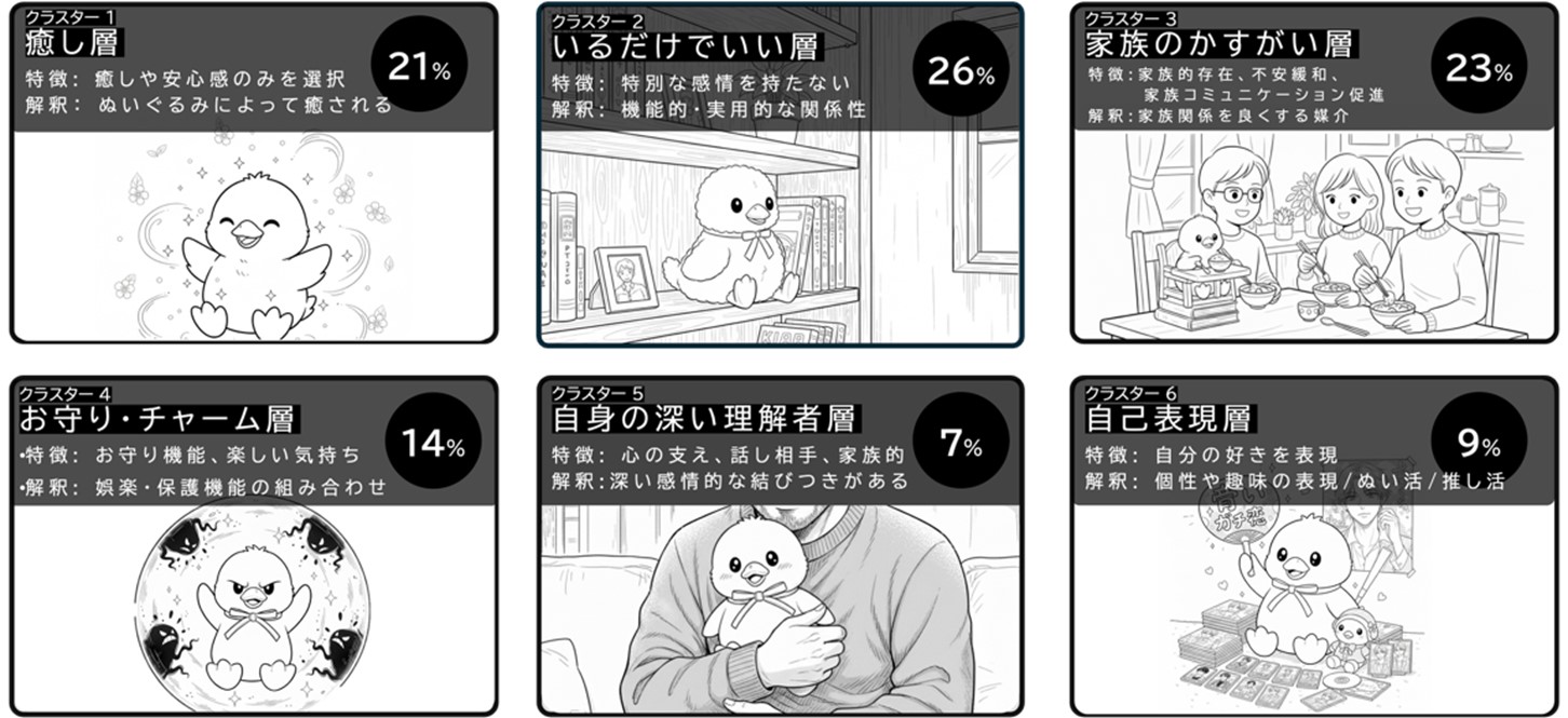ぬいぐるみの存在そのものを通じて、人は何を得ているのでしょうか。今回の調査では、中年男性にとってのぬいぐるみはどのような存在かを聴取しています。その結果をもとに、ユーザー層を6つに分類するクラスター分析を行いました。結果の分類は以下のとおりです。
