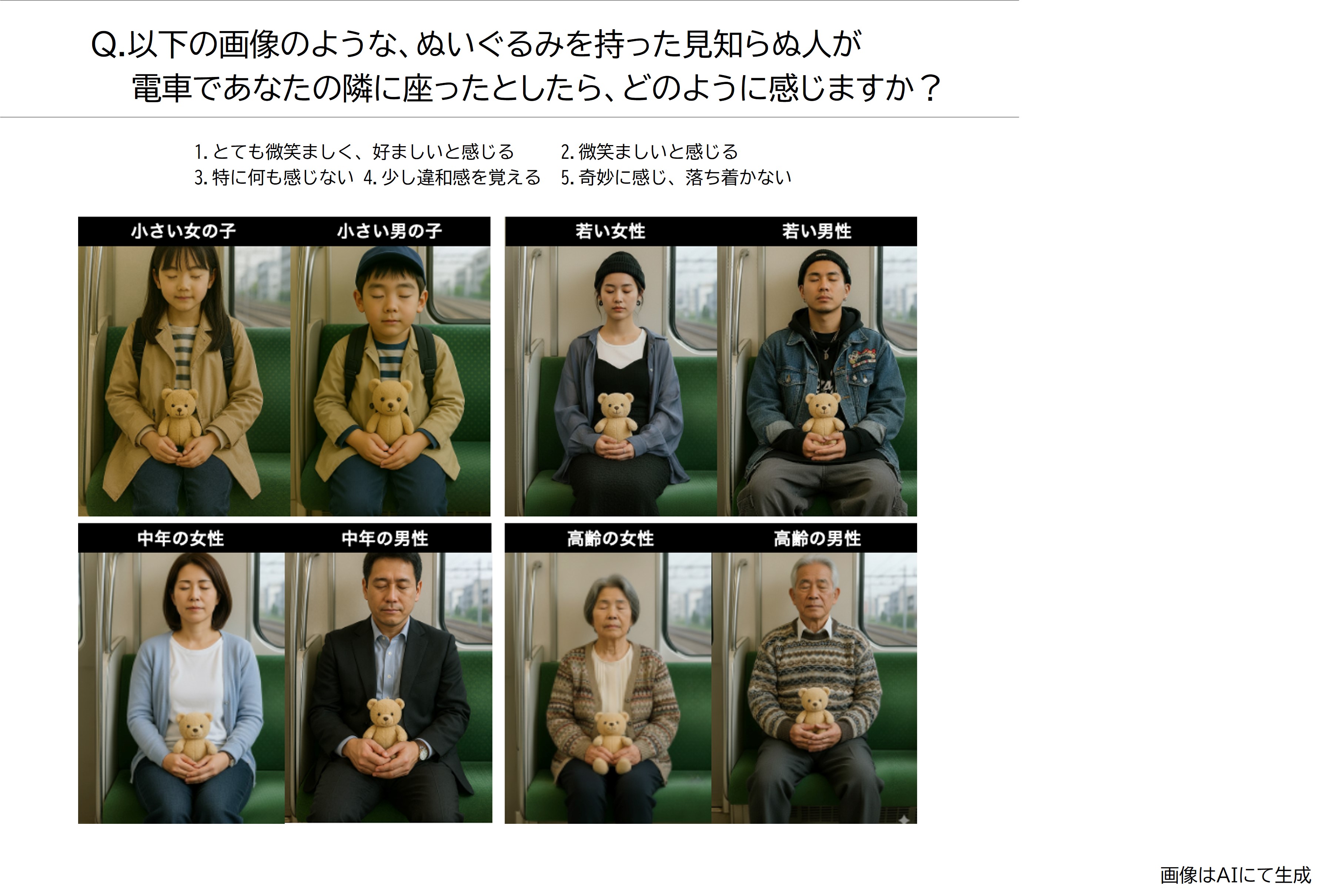 まず、ぬいぐるみを持つ人々への世間の印象を探るため、「もし、写真のような人が電車の中で隣に座ったらどう感じるか?」という質問調査を実施しました(N=665)。提示したのは、小さい男女、若い男女、中高年の男女がそれぞれぬいぐるみを持っている写真です。