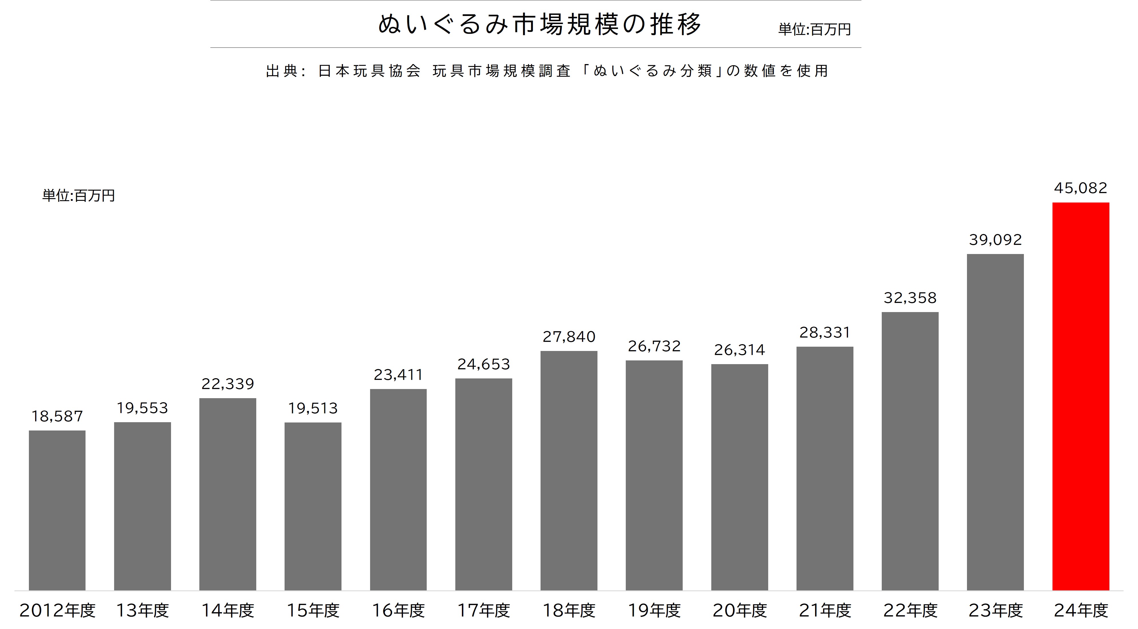 ぬいぐるみ市場が、過去最高の盛り上がりを見せています。市場規模はこの10年でほぼ2倍に拡大し、推し活効果も相まってさらなる成長が予測されます。
