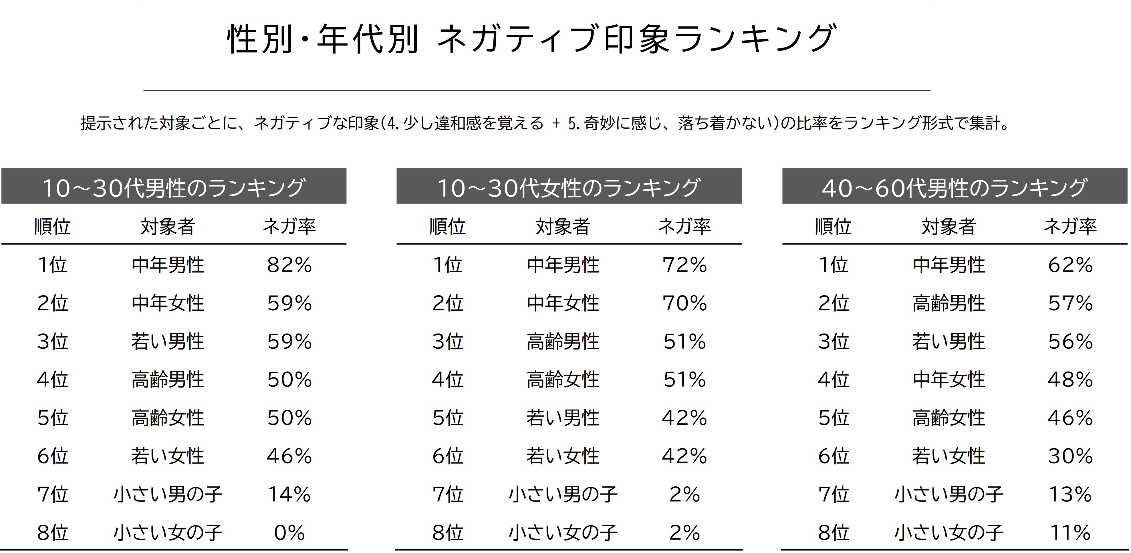 この結果からも改めて、ぬいぐるみという存在は、幼児性と女性性に強く紐づいている存在であることがわかります。ぬいぐるみを持つのが子供や女性であれば良いが、中年男性が持つと好ましくないと思われる。そして一番好ましく思っていないのは中年男性自身であるという事です。考えるに、中年男性というのは「大人」と「男」らしさを纏うべき存在であることから、対極のイメージを持つぬいぐるみを持つ中年男性は「奇妙な存在」なのでしょう。そして、何よりこの古典的な「大人の男らしさ」に一番強くとらわれているのが中年男性自身なのだと私は解釈しています。