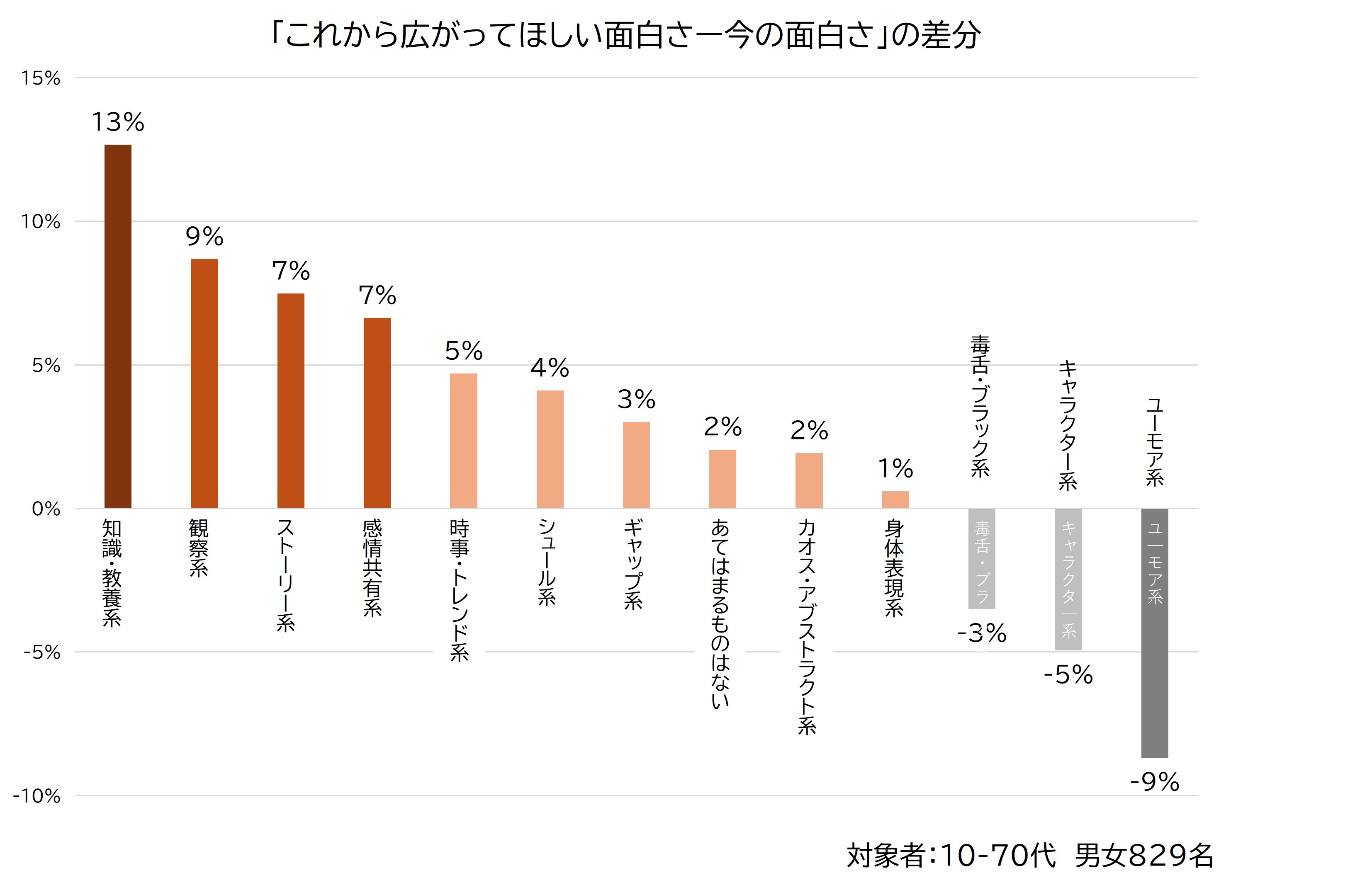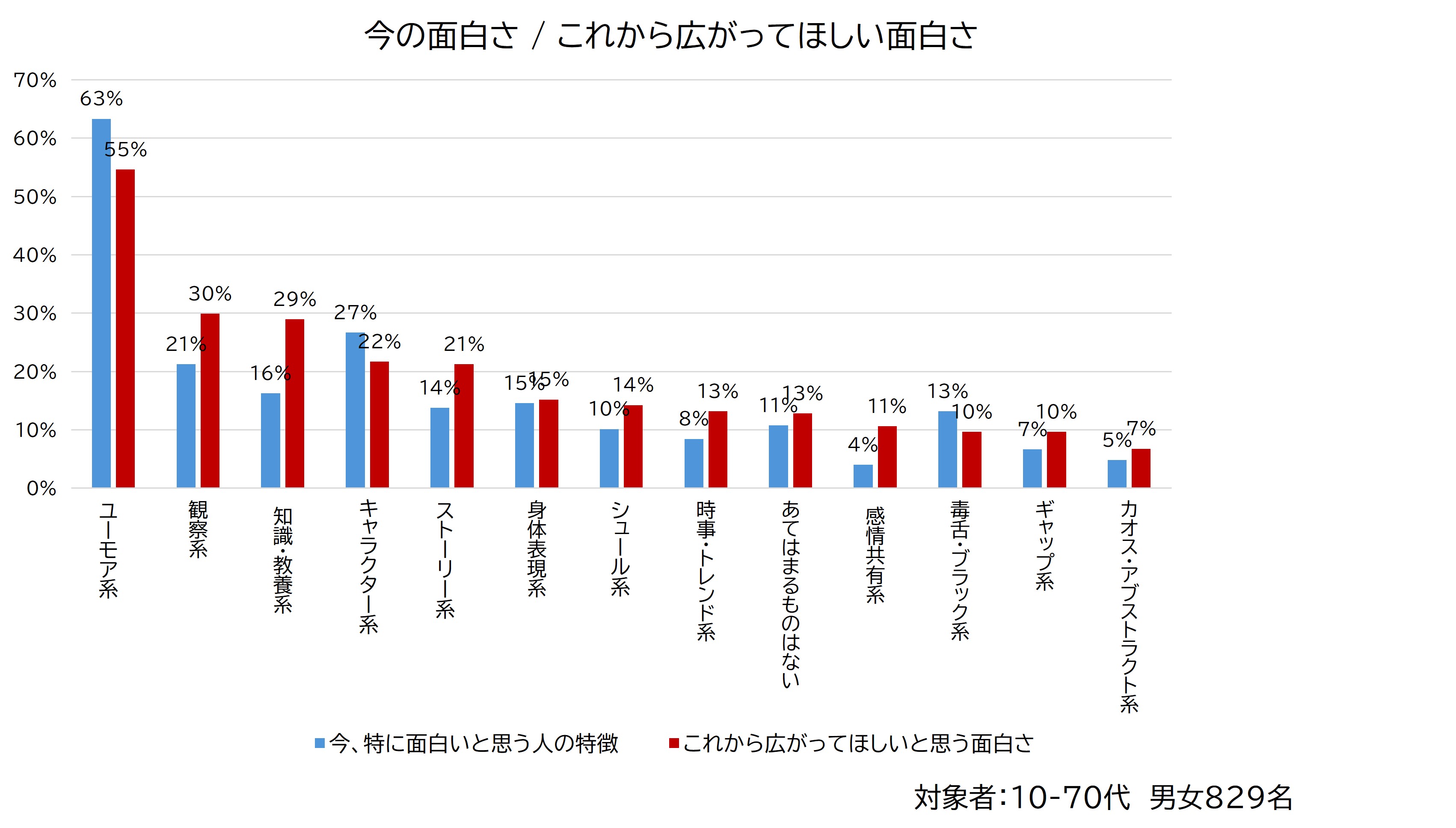 その結果、知識・教養系(知的なユーモアや専門知識)の笑いのスコアが、今の面白さ(16.3%)から今後広がっていってほしい面白さ(29.0%)へ12.7ポイントと最も増加していることが分かりました。