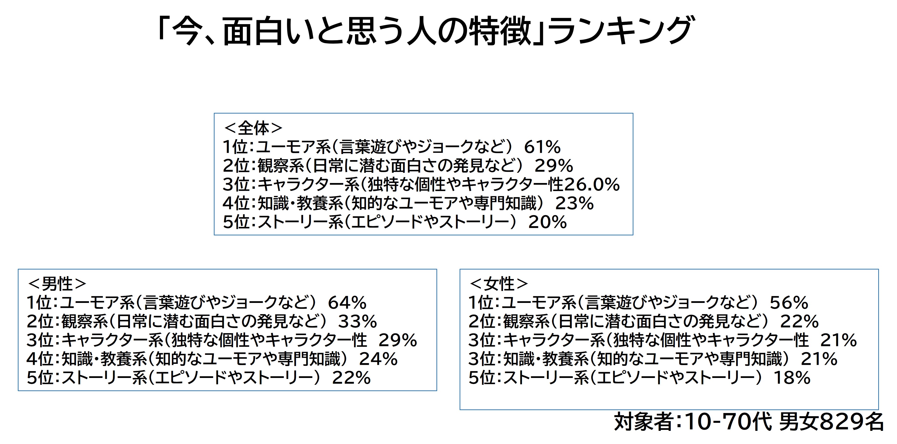 「あなたが普段『面白い』と思う人の傾向として、あてはまるものをいくつでもお選びください」という形で、10〜70代男女829名に対し複数カテゴリからの選択式で回答を求めました。回答を集計した結果、男女ともに最も多く支持を集めたのは言葉遊びやジョークなどの「ユーモア系」。次いで、独特な個性やキャラクター性を示す「キャラクター系」、そして日常に潜む面白さを示す「観察系」が続きました。やはり、現在形で「面白いと思うもの」を聴取すると、お笑い番組で芸人が披露するような「ぱっと見で面白いとわかる、瞬発力のある面白さ」が上位にあがってくるようです。