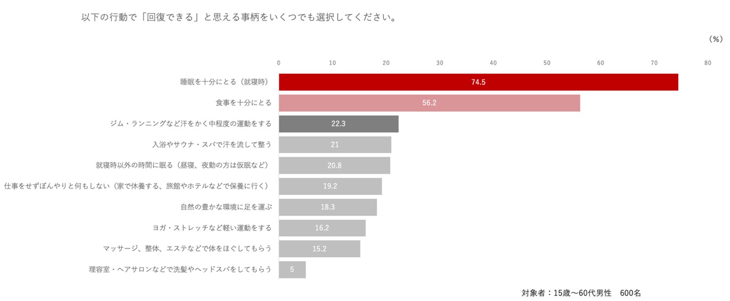 次に食事(栄養)を摂ること(56.2%)で、ヨガ・ストレッチや(16.2%)ジム・ランニング(22.3%)など、自己の回復のために積極的な行動をとる「アクティブレスト」の行動をあげる男性も多い結果となりました。