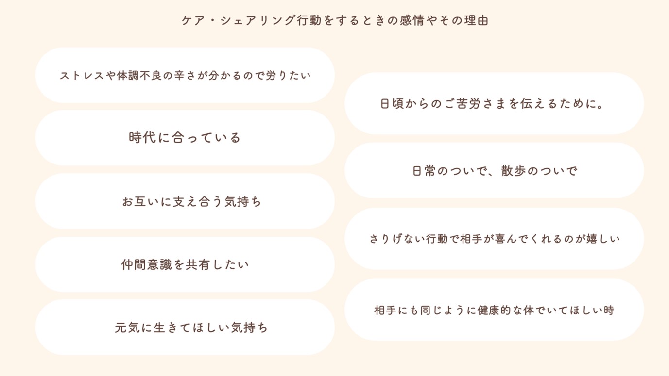 多く見られた「相手が喜んでくれるのが嬉しい」や、喜ばせたい、楽しませたい、だから行動しているという内なる企画心は次のケア・シェアリング行動を後押しすると捉えられるでしょう。
